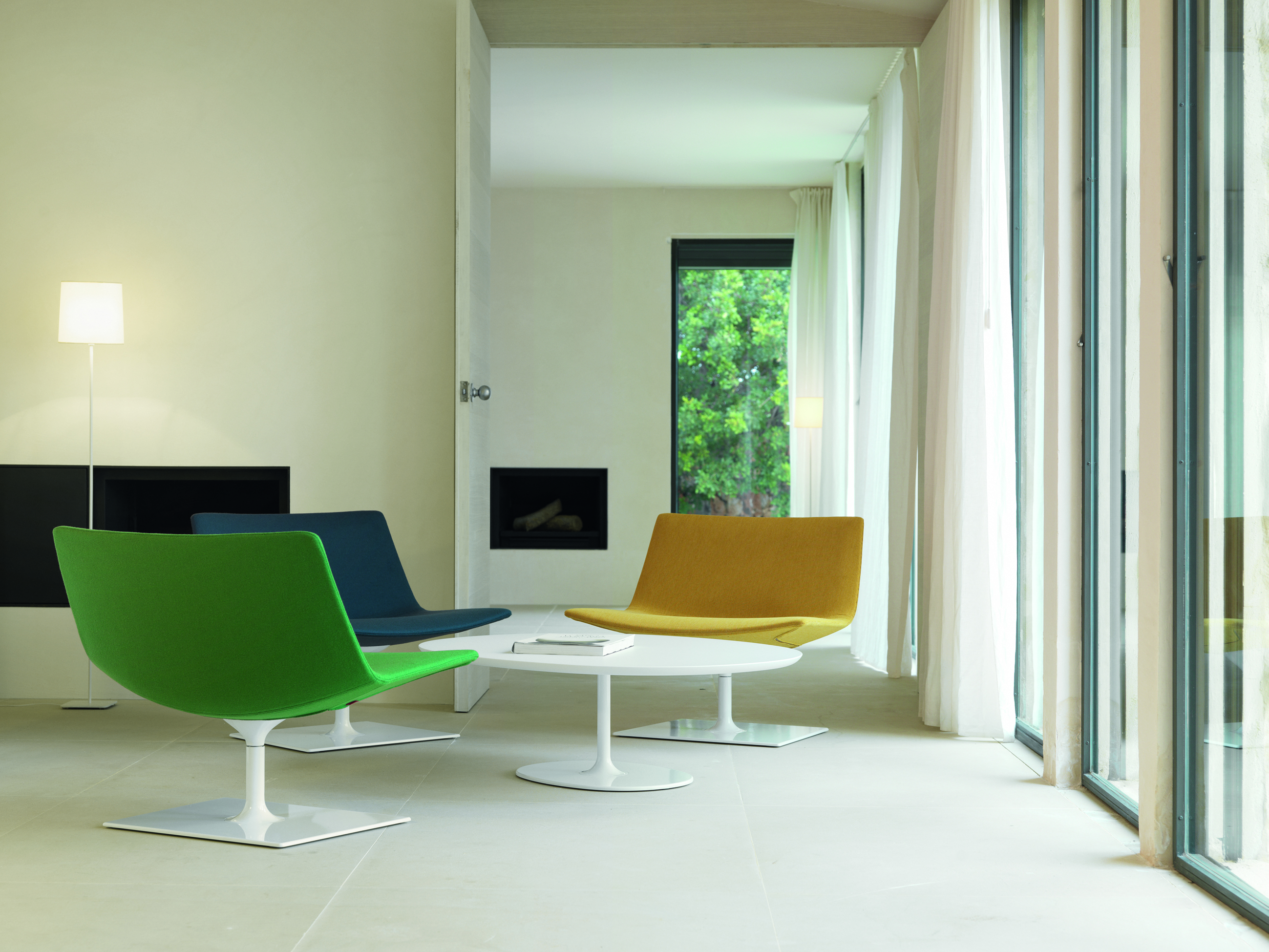 Der Catifa 80 ist ein leichter, niedriger Lounge Sessel mit ausgeprägtem horizontalem Charakter. Das sparsame Profil und die breite Sitzfläche wirken großzügig, ohne dabei schwerfällig oder sperrig zu erscheinen. Alleinstehend ist der Catifa 80 ein stiller, bequemer Ort der Erholung, in Kombination wird er zum Ruhepol für den Warte- oder Empfangsbereich.