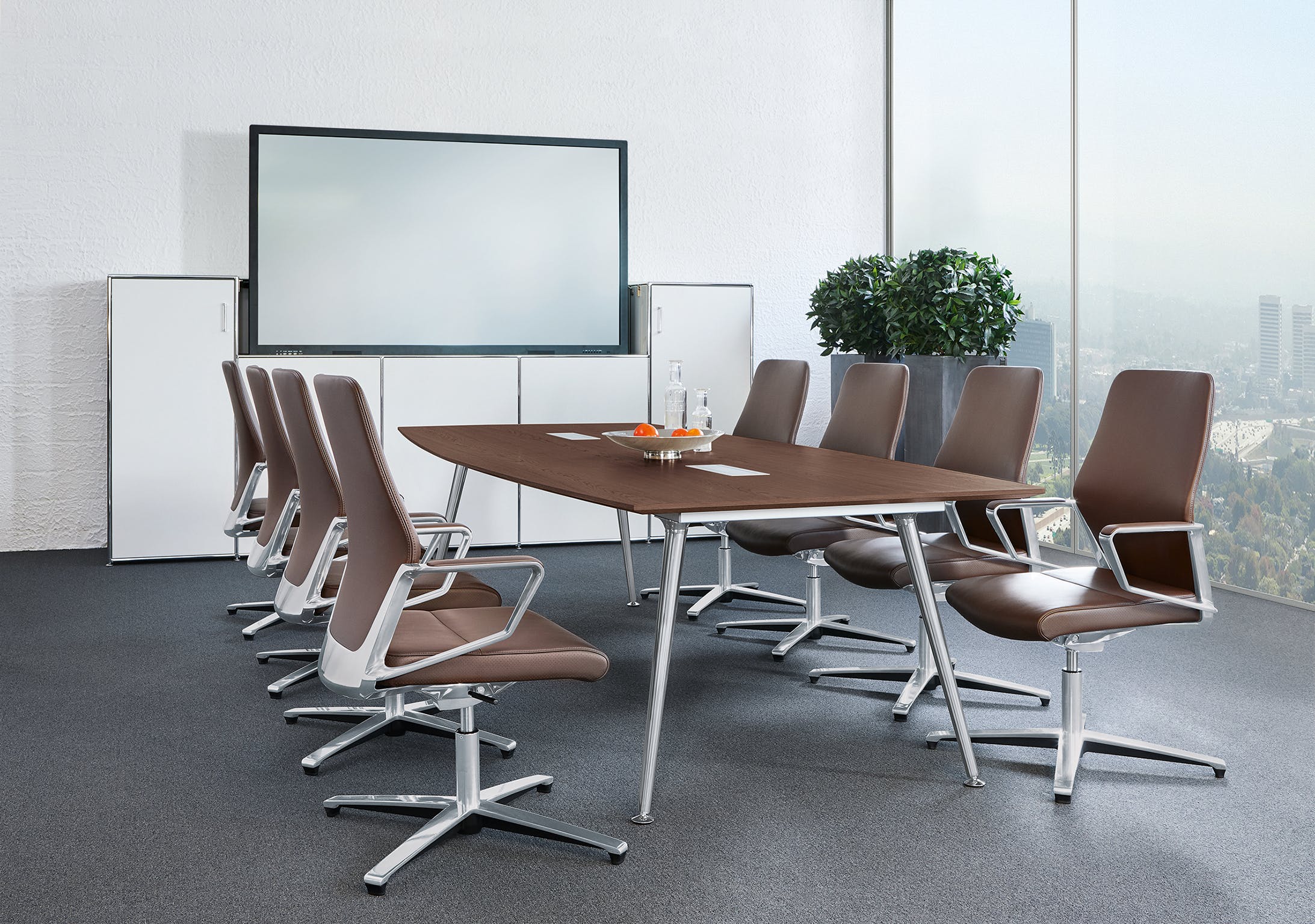 Die Meeting-Reihe unterstützt die Kommunikation im Büro. Connect Meetingpoints laden in Mittelzonen von Open-Space-Büros zu Projekt- und Teamarbeit jenseits des Arbeitsplatzes ein. Ob im Stehen oder Sitzen – Versammlungen um die elektrifizierbaren Möbel mit standardmäßiger Ablage unter der Arbeitsfläche regen die Ideenfindung an. Alle Medienanschlüsse von Monitoren und Rechnern können in die Arbeitsfläche integriert werden, die weitere Verkabelung erfolgt unsichtbar. Conference Besprechungstische in unterschiedlichen Geometrien erhalten Sie neben der starren Variante ebenfalls in elektromotorisch höhenverstellbarer Ausführung. So ermöglichen Sie wechselnde Besprechungssituationen, verhindern Müdigkeit und fördern effektive und lebendige Vorträge, Workshops, Seminare und Schulungen.